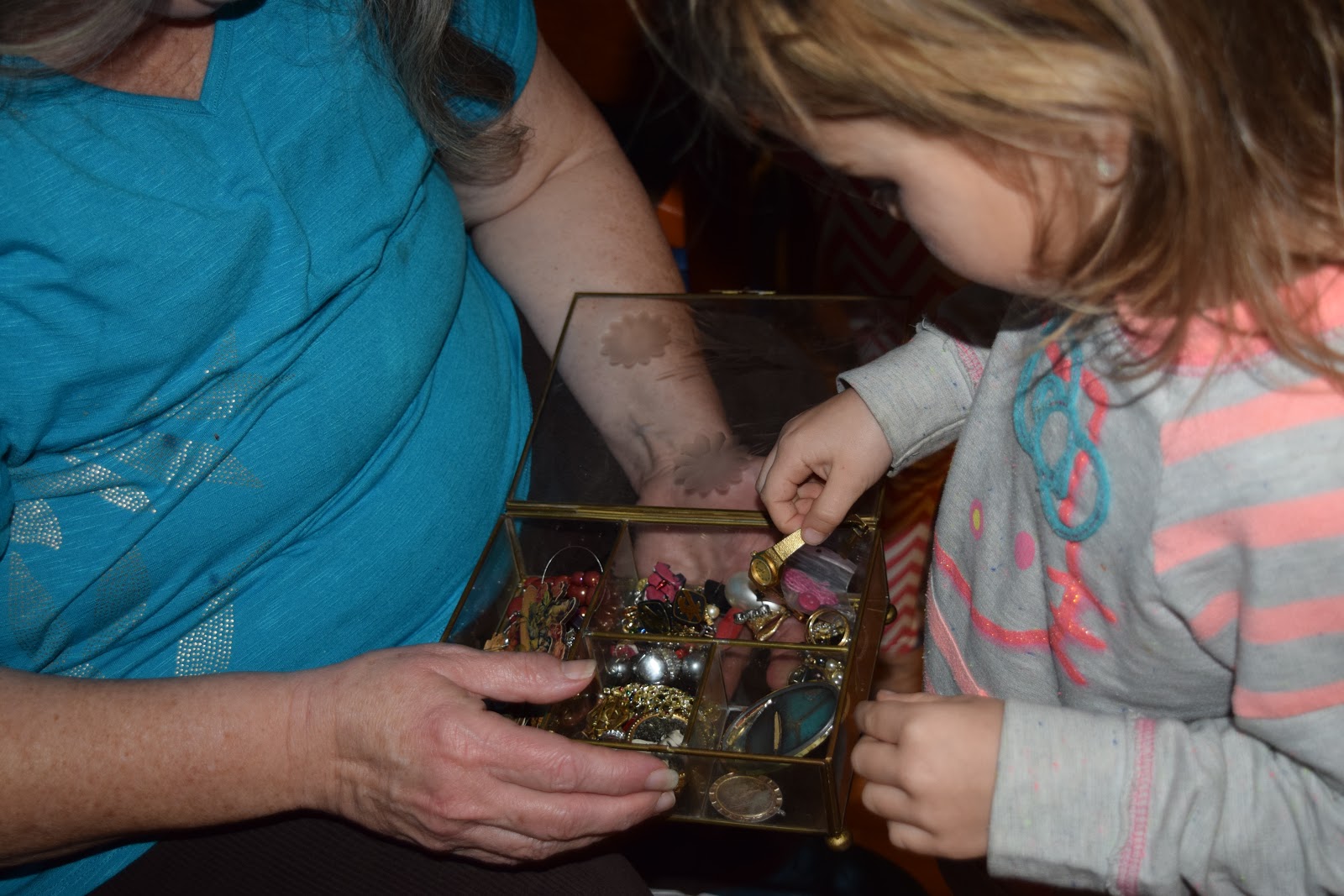 Then there was another Sunday lunch when I let the kids pick through Mom's junk jewelry.  I love how anything metallic is beautiful to a four year old.