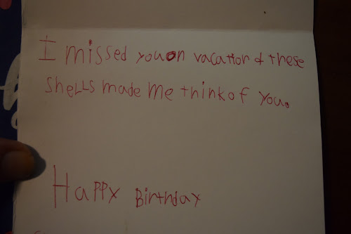 Giddy-Up took his first beach vacation without his Gramerly and saved shells and some sea glass to make me a card. Whaaaa.